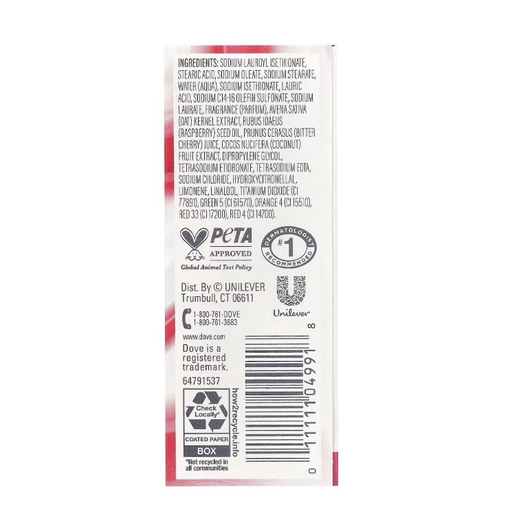 المكونات: لوريل إيزيثيونات الصوديوم، حمض الستياريك، حمض اللوريك، بالميتات الصوديوم، ماء، إيزيثيونات الصوديوم، ستيرات الصوديوم، كوكاميدوبروبيل بيتايين، عطر، نواة نخيل الصوديوم، كلوريد الصوديوم، بروبيلين جليكول، جلسرين، إتيدرونات رباعي الصوديوم، إيديتا رباعي الصوديوم، مستخلص نواة الشوفان، زيت بذور عباد الشمس، مستخلص أوراق إكليل الجبل، أكسيد الزنك، زيت قشر البرتقال، زيت قشر الليمون، أسيتات جيرانيل، هيدروكسي سيترونيلال، ليمونين، لينالول، بينين، CI 14700، CI 17200، CI 77891